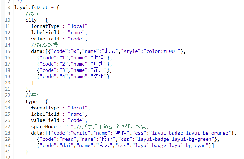数据字典,必须在layui.js后面引入数据字典文件/plugins/frame/js/fsDict.js,数据字典使用说明