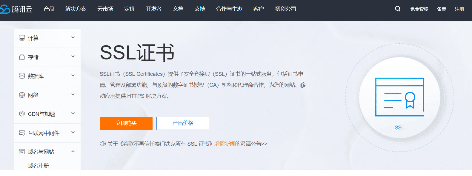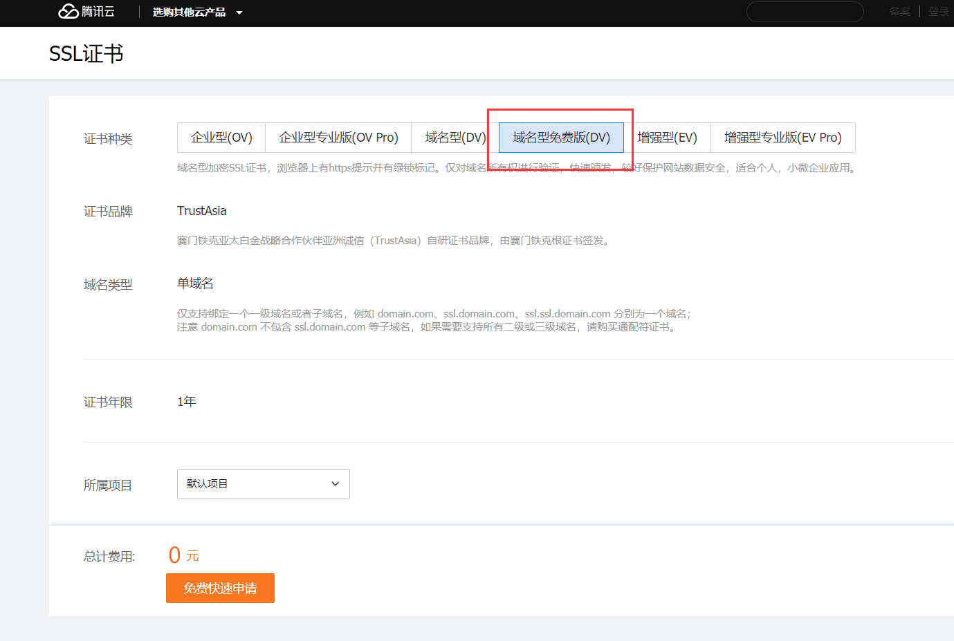 本文介绍如何使用腾讯云申请免费证书,其他的服务商也类似。