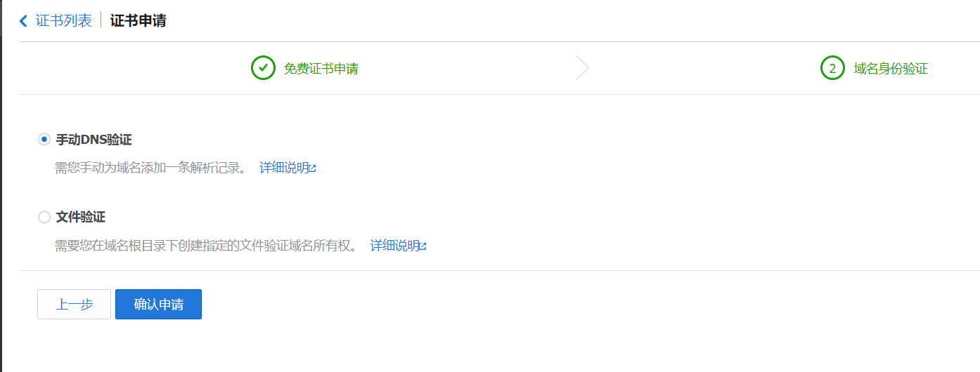 手动DNS验证或文件验证,验证方法参考详细说明,点击确认申请
