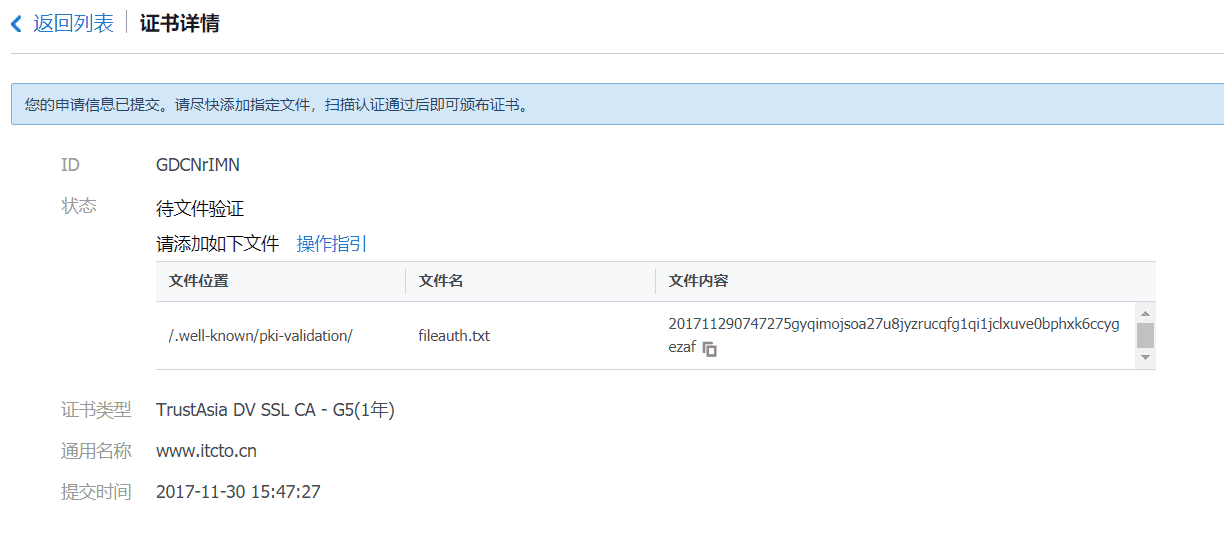 证书申请详情页,查看需要配置的信息,根据提示信息增加域名验证,域名验证成功后,会在1个小时内,邮箱会收到颁发的免费证书。